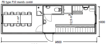 Frokoststue med køleskab, overskab. Monteret med vinduer/rollers. Toilet & omklædning. El i hvert hjørne. Der er monteret PVC dør i midt på den ene langside og blind element i gavl (kan flyttes til langside).