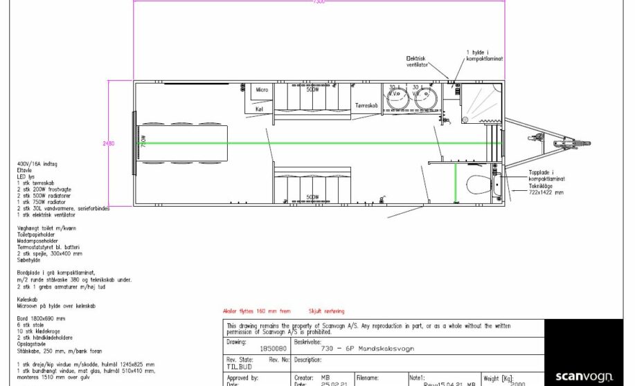 Mandskabsvognen er en ideel løsning, når der er behov for et kontor eller spiserum i nærheden af byggepladser. Vognen har et opholdsområde, et omklædningsrum med stålskabe, tørreskab og bænk, et vandskyllende toilet med kværn samt et særskilt baderum med bruser, hylder og bænk.
