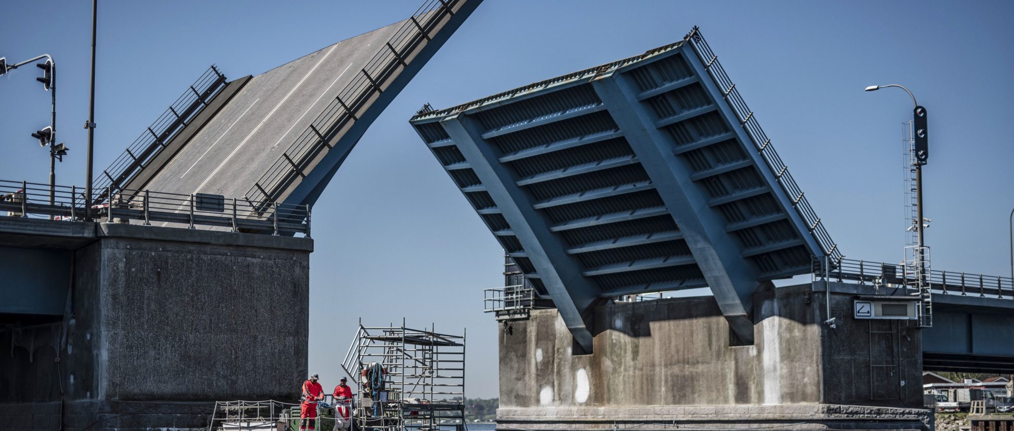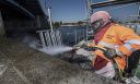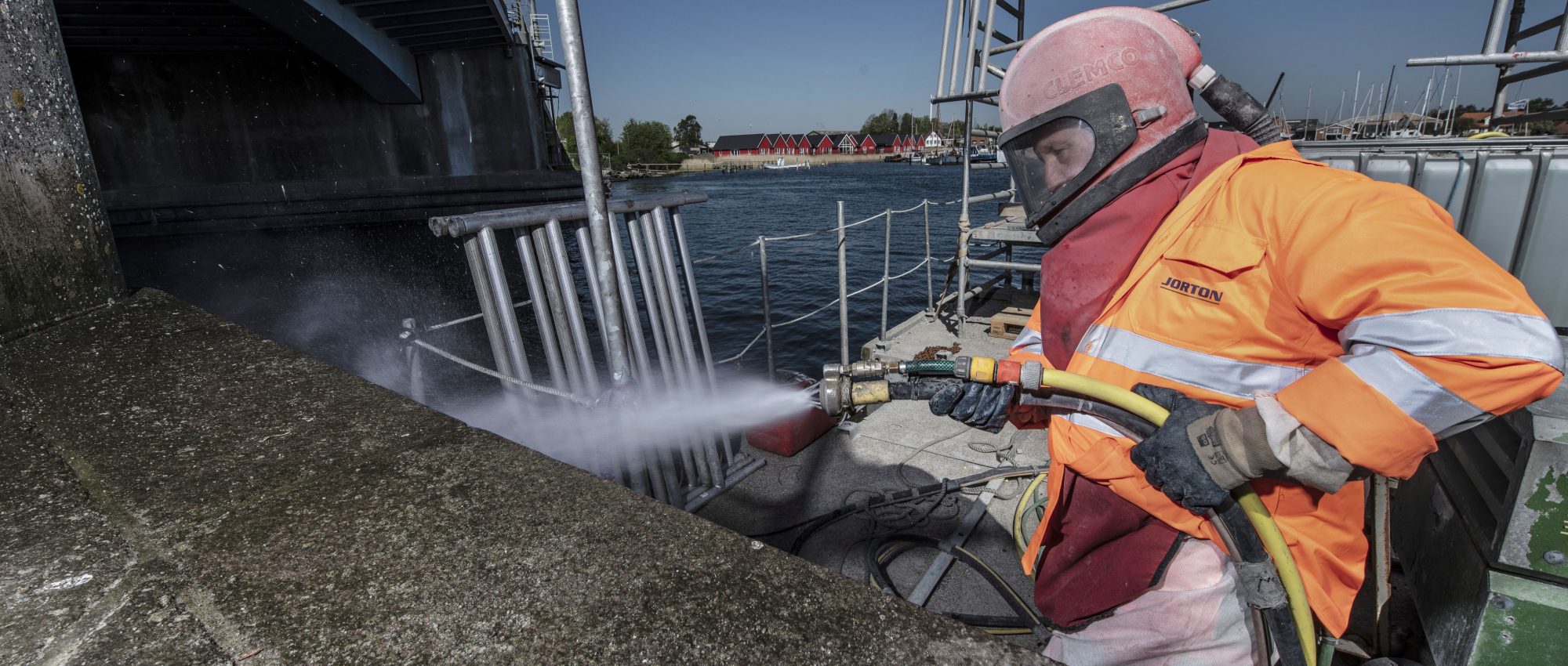 Efter delamineringsundersøgelser på alle betonoverflader på bropillerne, blev skrukke/dårlige områder mærket op i samarbejde med tilsynet (COWI). Herefter blev behugning og sandblæsning af overflader påbegyndt. Reb blev monteret på hele klappillernes bredde, så der kunne lægges til hver morgen. Denne løsning sikrede, at beton- og sand fra behugning og sandblæsning blev opsamlet på flåden.